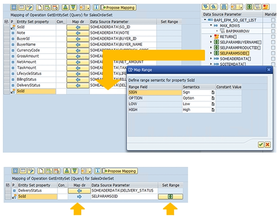 Use Propose Mapping to automatically generate and display the available mapping relations between the properties of the entity set and the parameters of the data source.