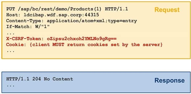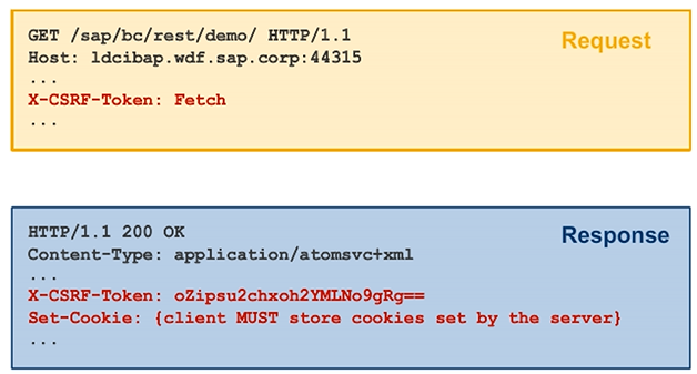 The CSRF protection mechanism for all state-modifying requests (POST, PUT, DELETE) requires an X-CSRF-Token along with an asap-XSRF_<SID>_<Client> cookie. The token is encrypted and stored as part of the anti-CSRF cookie. It is bound to a certain user and is validated against a value of the anti-CSRF cookie.