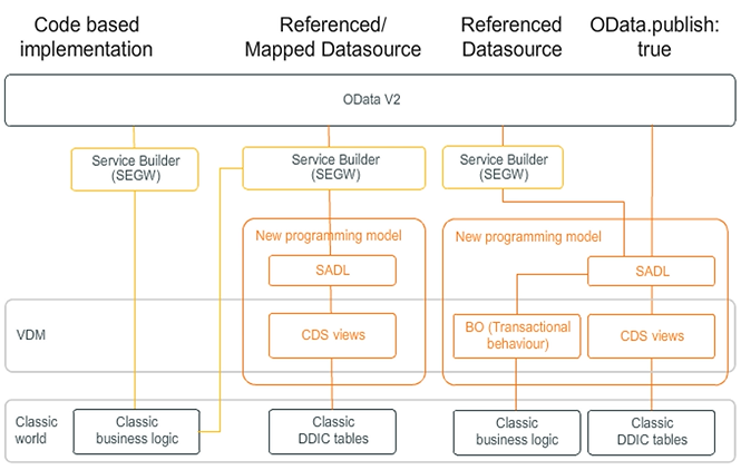 A first use of CDS views when developing OData services became available with AS ABAP 7.40. The read and query methods are generated using the mapped data sources, while the create, update, and delete methods have to be implemented using code-based implementation. The mapped data source approach is described in Unit 6, Lesson 2. This is where the Service Builder using the referenced data source approach comes into play.
