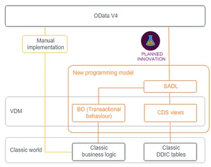 The use of referenced data sources is not limited to access data via classic APIs. It can also be used as an extension layer for applications that are based on the new programming model and that perform their updates via BOPF. Here, the ABAP layer can be used to add additional annotations to the metadata of a service that is not supported by CDS. It is also possible to implement additional business logic via ABAP code, though both extension options should be avoided if possible.