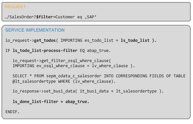 At the beginning of our service implementation we have to check whether we have to handle the filter option. We call method io_request->get_todos. Then we have to check whether the ls_todo_list-process-filter flag is set. If yes, the filter string is requested via method io_request->get_filter_osql_where_clause and the flag that we have handled the filter query option is set in the ls_done_list structure. This information is, at the end, sent back to the framework via method io_response->set_is_done that takes the Done list as a parameter.