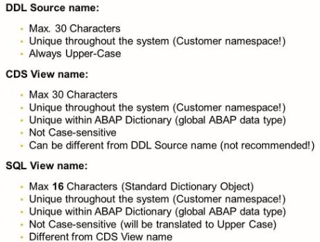 Regarding the names of DDL Source, CDS entity, and SQL view, there are some hard rules enforced by the development tools, and mere recommendations that are intended to increase clearness and readability.