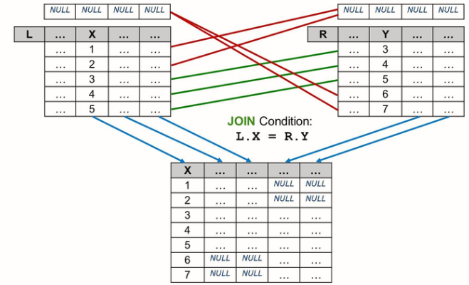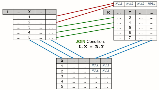 In addition, rows of the left table without a matching row in the right table are copied to the query result. The missing values are filled with NULL values.