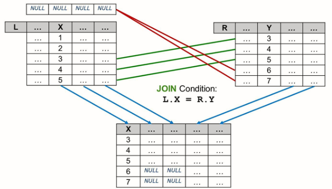 As a reminder, the picture above illustrates an inner join: One row of the left table and one row of the right table are combined to a common result row if they fulfill the JOIN condition.
