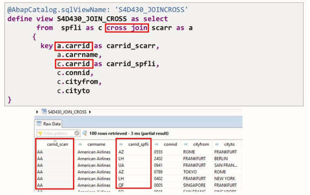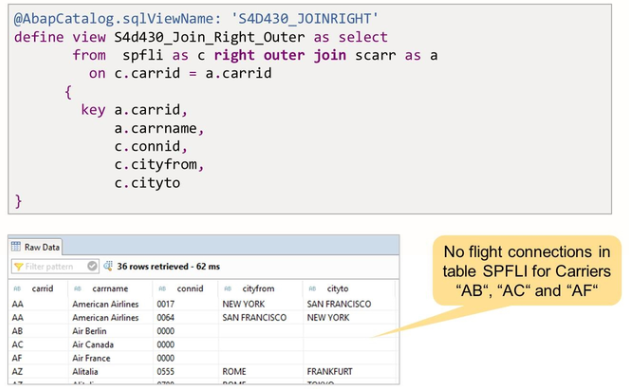The figure gives you an example of a CDS view with a right outer join. The data preview for this CDS view clearly shows the entries from the right table without matching entries in the left table.