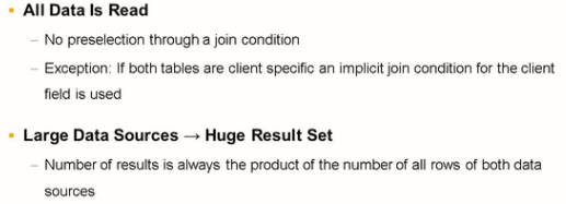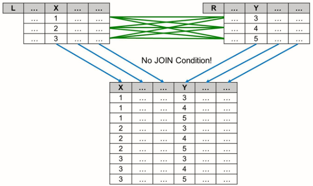 When two data sources are joined using CROSS JOIN, the result is the cross product of these two data sources: All entries on the left side are combined with all entries on the right side. The number of rows in the results sets is the number of rows on the left side multiplied by the number of rows on the right side. It is not possible to specify a join condition for cross joins.