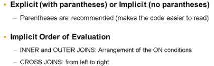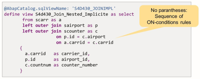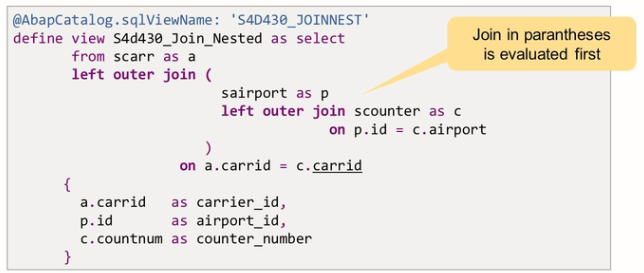 The FROM clause of a CDS view definition allows nested join expressions. You can use brackets in order to influence the sequence in which the system evaluates these nested expressions.