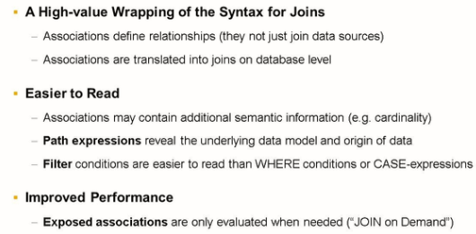 The syntax of associations keeps the relations between data model entities visible. Path expressions and filtered associations make it easier to read the CDS View definitions, as well as the SELECT statements accessing the view.