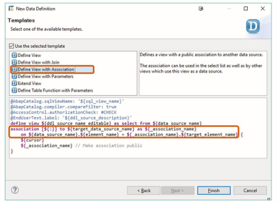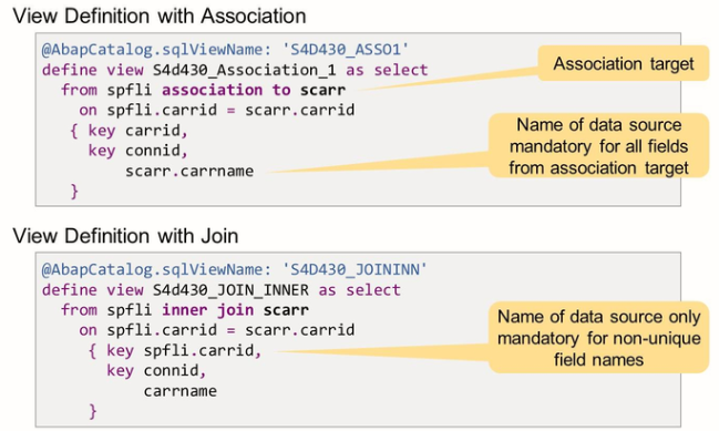 At first glance, associations are just another syntax for defining joins. There is a small difference in the element list: in the element list of a join, specifying the data source for a field is only mandatory for non-unique field names. In the field list of a view with an association, all fields without an explicit source are taken from the primary data source. For all fields from the associated table, it is mandatory to specify the data source.