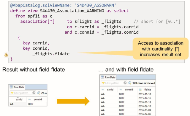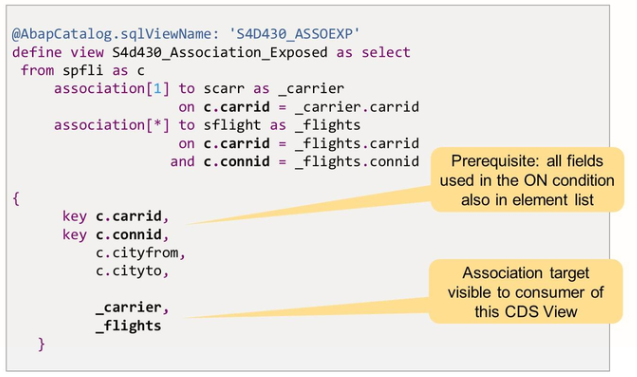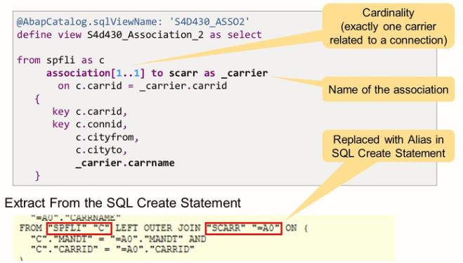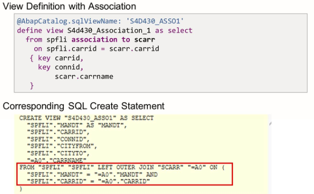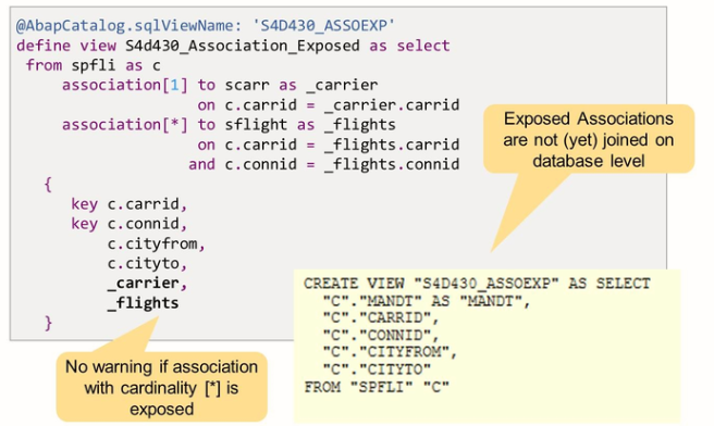 The association above shows the SQL Create a statement for CDS views with the exposed association. You can see that in the case of an exposed association the SQL view does not immediately join the associated data source. The actual join of the data source is not done until the consumer accesses individual fields of the associated data source.