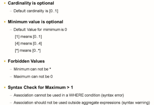 In the SQL Create statement, the association name is replaced by a more generic alias. This means that association name is only a semantic information. Specifically, a cardinality after key word ASSOCIATION is optional. If the cardinality is not explicitly defined, the cardinality “0..1” is implicitly used.