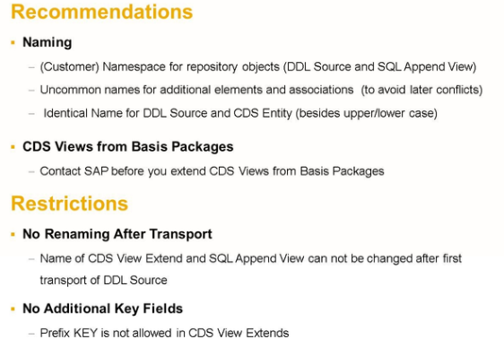 The most important restriction also refers to naming: After a DDL source has been transported from the development system, the names of the SQL Append view and the CDS View extend are fixed and cannot be changed anymore.