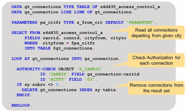 The example shows a program that displays all flight connections departing from a given city. To make sure the user does only see data for which he has display authorization, the program does a loop aver the selection result set and removes the records for which the users lack authorization.