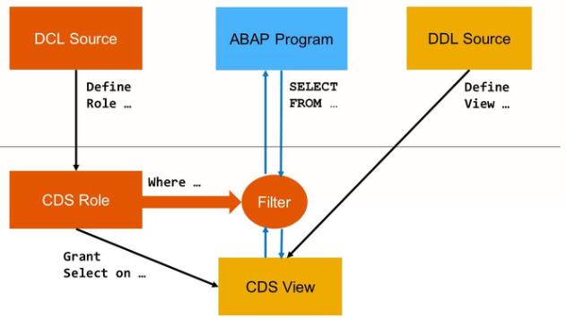 The figure shows the basic principle of CDS Access Control. A new repository object DCL Source defines a CDS Role. It relates the CDS role to one CDS views and defines access conditions for this CDS view. Wherever an ABAP program accesses this CDS view, the database interface will automatically filter the selection result according to the access conditions.