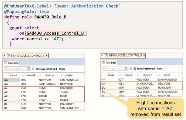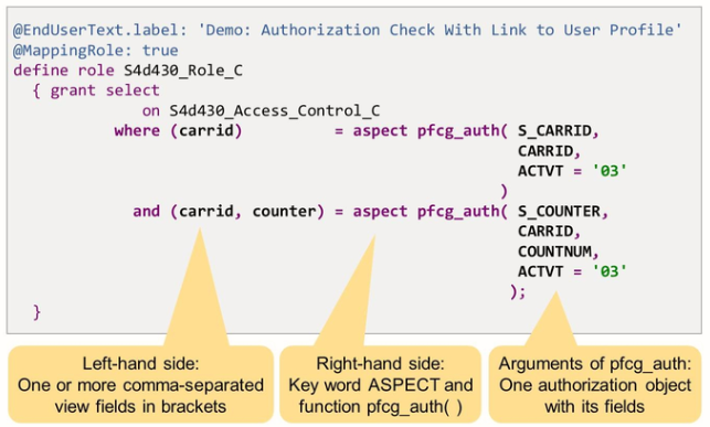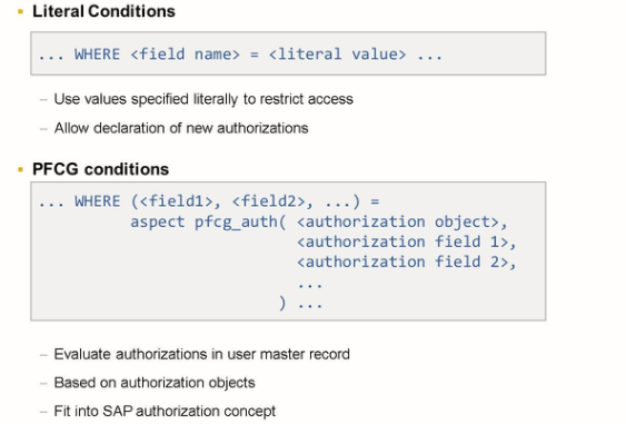 The first condition is based on an authorization object S_CARRID. In ABAP, the corresponding AUTHORITY-CHECK statement would look like this: