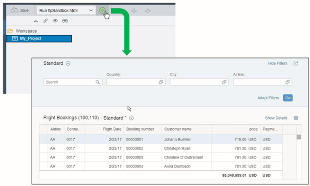 The generated application is tested in SAP WebIDE by running the project in flpSandbox.