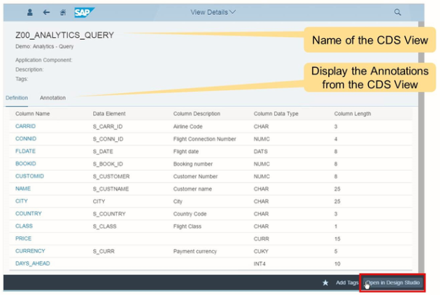 On the Annotation tab, you will see additional details on access control, VDM view type, Analytical query, End-user label, and the ABAP catalog view name. The CDS in-front of the ABAP catalog view name means it is a CDS view.