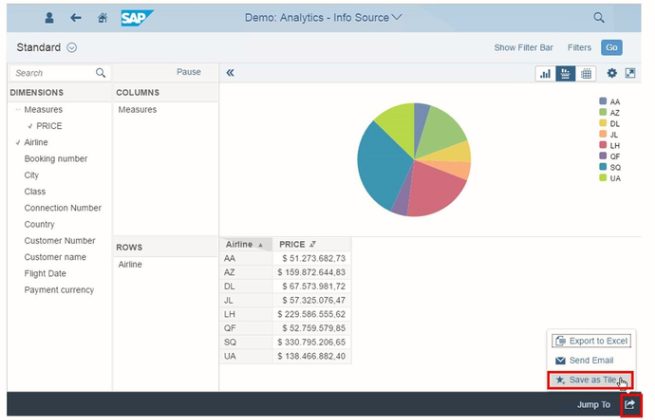 The resulting screen shows the selected data in a table and pie chart. The look and feel of this result page can be customized. The query can also be saved as a Fiori title by clicking the Actions button on the bottom right and then select Save as Tile. In the Save as Title pop-up, you can specify the Title and subtitle to be displayed in the Fiori launchpad.