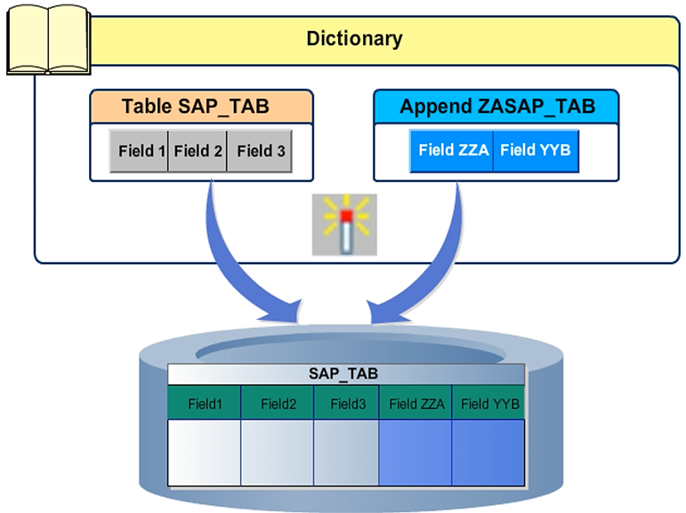 When a table is activated, all the active append structures for the table are found and their fields are appended to the table. If an append structure is created or changed, the table to which it is assigned is also activated.