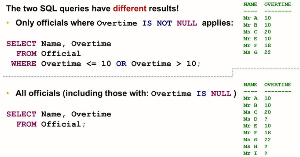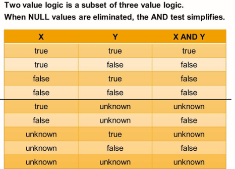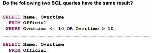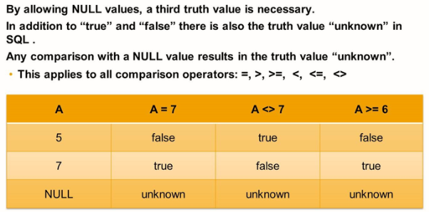 The introduction of the logical value “unknown” and the way expressions are evaluated by first evaluating their atomic sub-expressions lead to an unexpected result: Logical expressions that always evaluate to true in usual programming languages and according to common sense no longer evaluate to true in all cases. The following list shows some example: