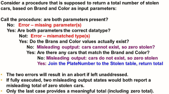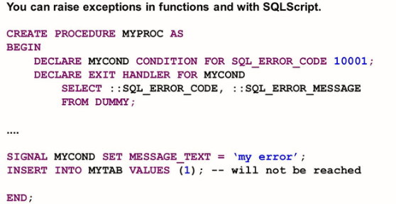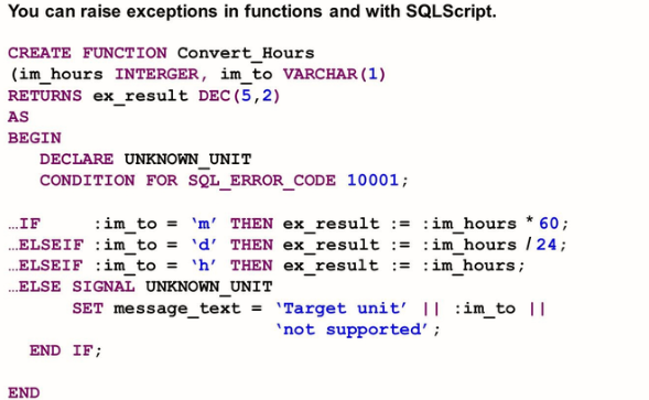 In addition to the sorts of exceptionally previously described, there are circumstances in which values may meet the technical requirements of SQL Script, but can still lead to undesired or nonsensical results. In such cases, it is helpful to trap the problematic values and lead the SQL Script code to a clean exit, preferably one that informs the end-user about what problems occurred and how to avoid them in the future.