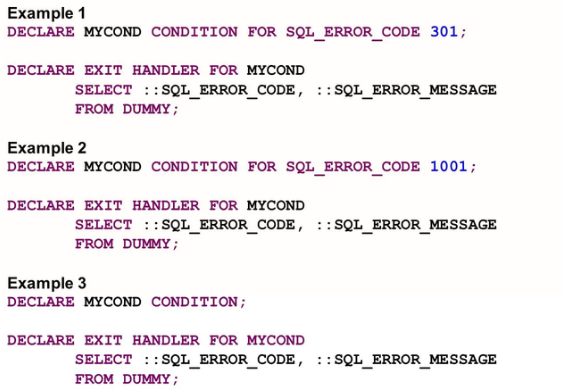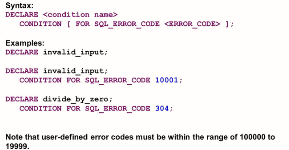 When a CONDITION has an error code assigned to it, it may be returned to the user when the CONDITION is raised. This is useful, because it allows the returned: SQL_ERROR_CODE to indicate not just that a block of code has finished executing, but the exit point at which it finished. CONDITIONS may be referenced by EXIT HANDLERS, as shown in the code fragments