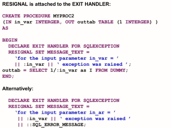 In the first example, an integer is supplied as input, and its reciprocal integer returned as output. If a zero value is supplied, a divide-by-zero will be raised and caught by the EXIT HANDLER as a SQLEXCEPTION. In this case, the RESIGNAL command is used to place customized text in the error message- the string for the input parameter in_var = is concatenated with the value of: in_var and the string exception was raised.