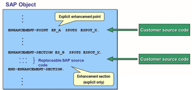 Explicit enhancement points and sections are provided by SAP and allow you to enhance SAP Source code by inserting your own logic, without making modifications. You can identify explicit enhancement points by searching for the ENHANCEMENT-POINT syntax. Enhancement points can either be static (to allow additional data declarations) or dynamic (to allow additional executable code).