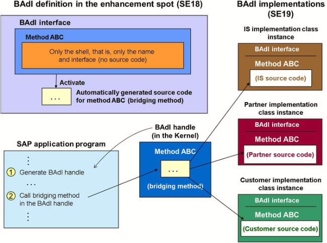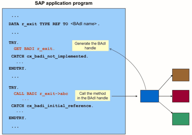 The SAP program branches to the relevant implementation when the bridging method in the BADI handle is called (Call BADI). If an initial handle reference is used for the CALL BADI statement, exception cx_badi_initial_reference is triggered.