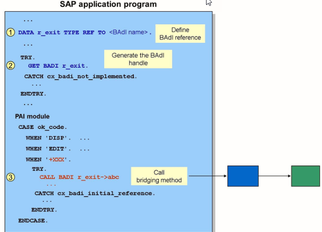 When a customer implements a BADI of this type, they do not just specify the text for the additional menu option. They must also implement the BADI program exit with the coding that will be executed when the user chooses the menu entry. When the BADI menu exit is implemented, the entry in the SAP screen menu is activated and will be visible. If the user chooses the menu entry, the custom logic is processed.