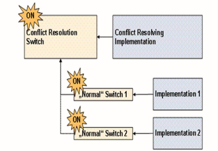 - The state of the switches assigned to the conflict switch determines whether an enhancement implementation will be replaced by a conflict-resolving enhancement implementation
