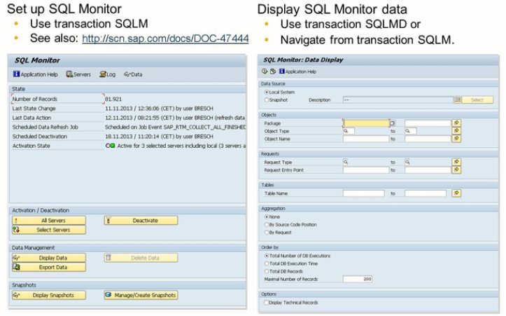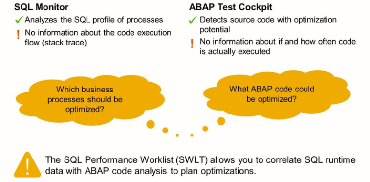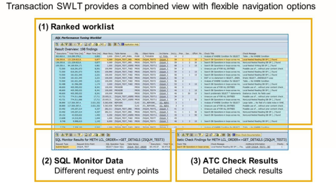 For performance optimization, combine the results of both static source code analysis(carried out via the ATP or Code inspector ) and the SQL Monitor runtime data.