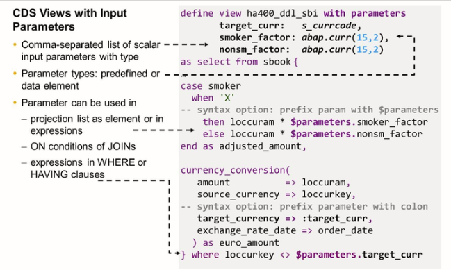 The WITH PARAMETERS ( )… syntax in the CDS DDL allows for the definition of a CDS view with a comma-separated list of the scalar input parameter, as follows: -