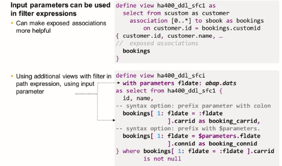 Input parameters can also be used in filter conditions in path expressions. This can make the definition of CDS view for re-use, with exposed associations, more valuable, especially when a parameter can be used in a filter expression to reduce a multi-valent association to a monovalent association.