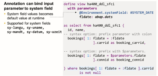 Using the annotation @Environment.systemField, you bind an input parameter to one of the ABAP system fields for the language with which the user is currently logged on, the user name, current date, time and client. This makes the input parameter optional for Open SQL queries and lets the value default to the system field value at runtime.