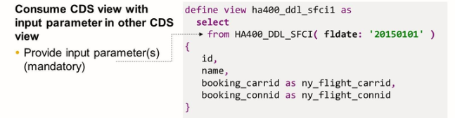 When defining a CDS view that uses a CDS view with input parameters, the parameters' values can also be passed in the FROM clause of the SELECT statement, as a comma-separated list of parameter name: Value pairs, enclosed in parentheses and following the name of the CDS view used.