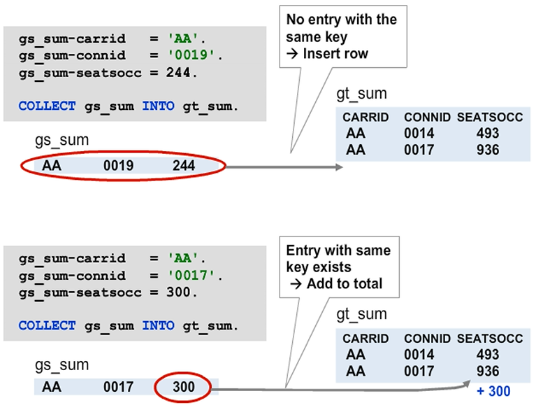 If the table does not have a line with the same key yet, the COLLECT statement has the same effect as an INSERT by key. If the table already contains one or more lines with this key, the runtime environment sums the values of all non-key fields in the new line to the corresponding values in the top line.