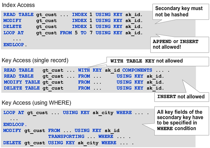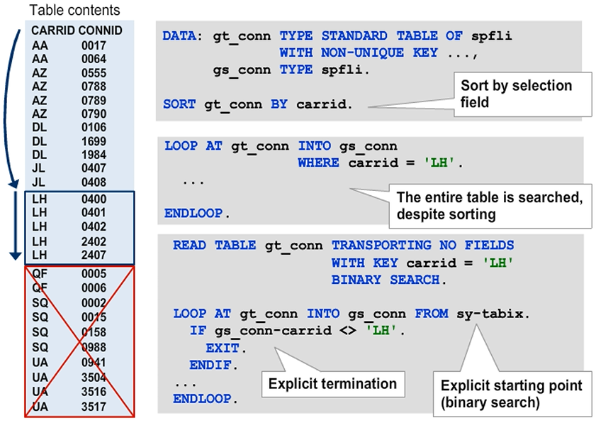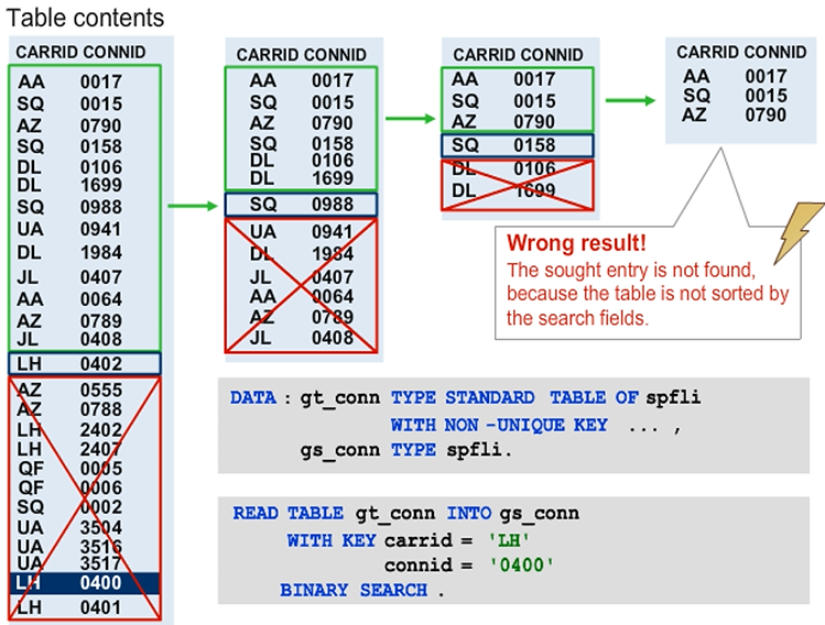 When sorted tables are accessed using their keys, the runtime environment performs a binary search to reduce the access time for large tables. With the BINARY SEARCH addition, you can make the runtime environment apply the same binary search algorithm in a key access to a standard table. Using the binary search during key access is helpful when the internal table is already sorted by the fields you use to restrict access. However, as shown in figure, using a binary search when the table is not sorted leads to incorrect results.