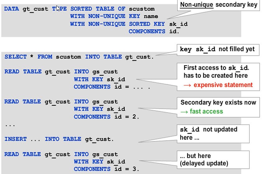 Caution: Using the COLLECT statement with standard tables can result in poor performance. Keep in mind that the runtime environment has to search for a line with a given key during each execution of COLLECT. With a standard table, this search will take longer and longer the larger the table gets. We recommend that you use the COLLECT statement only for sorted or hashed tables. It is best suited for hashed tables.