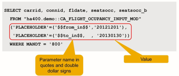 Parameters can be optional but may be mandatory. Parameters can have a default value but will not necessarily have one. You pass parameter values to the SAP HANA view immediately after the view name in the FROM clause.