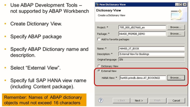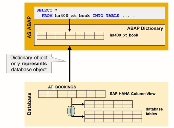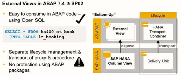 External views can be created in an ABAP system using SAP HANA as the primary database. An external view represents an SAP HANA view on the ABAP side, as a proxy for an SAP HANA view in the ABAP Dictionary. It makes the view and its field list visible to the ABAP stack and allows for access to the SAP HANA view via OPEN SQL and for the performance of syntax checks.