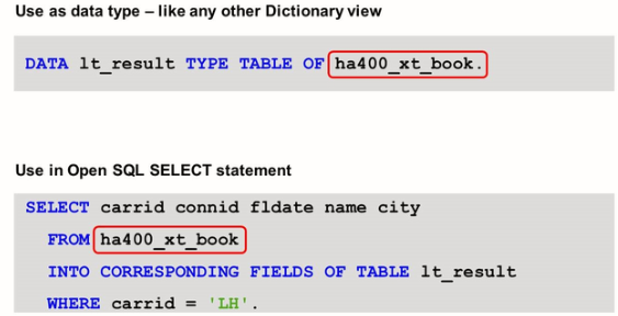 Once the external view is created and activated, you can declare local variables and internal tables ABAP tables using it as a structured data type, and you can retrieve data from the view using regular Open SQL select statements.