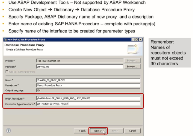 In the ABAP project, open the context menu and choose NEW ->Other or New -> Other ABAP Repository Object. Open the Dictionary folder and select Database Procedure proxy. Specify the following: -