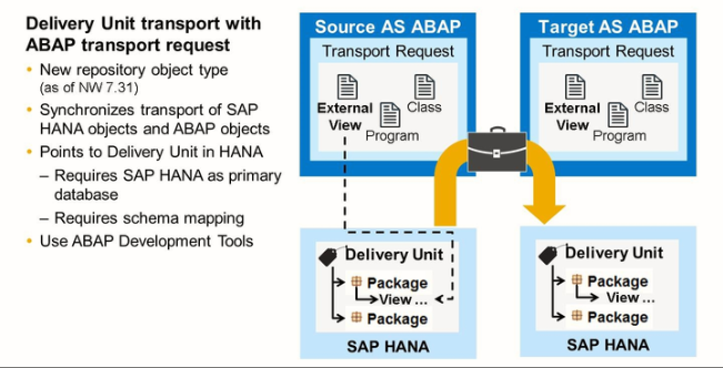 Transporting the dependent ABAP code so that it can be imported into target systems successfully requires the referenced SAP HANA content to be transported before or with the ABAP code. One way to achieve this is to transport the SAP HANA delivery units using the Enhanced Change and Transport System( CTS+).