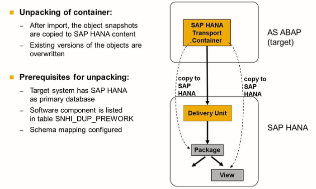When transported and imported into a target system, the snapshot is unpacked and the SAP HANA content is deployed into the SAP HANA database and activated.