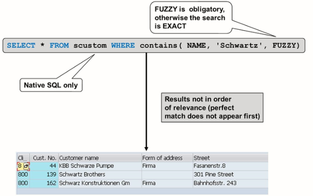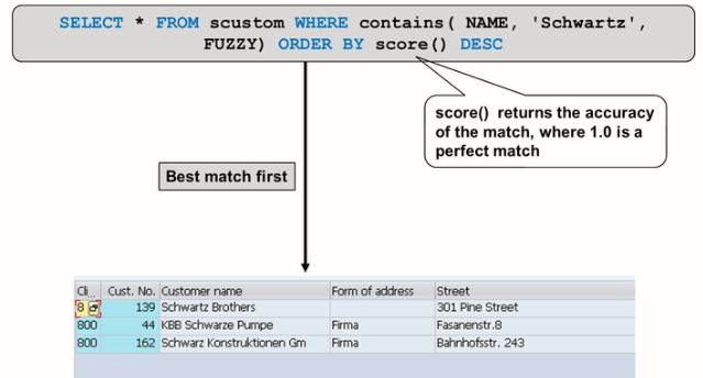 SAP HANA uses an algorithm that calculates the closeness of the match to the original search string and represents it as a score 0 and 1, where 1 is a perfect match. In the fuzzy search itself, you can specify the lower threshold, below which hits are no longer displayed, or you can use the default setting of 0.8.