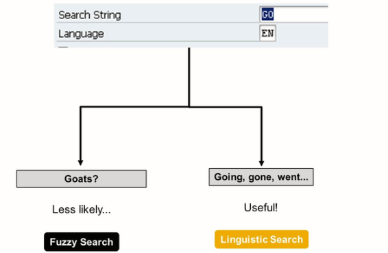 While the fuzzy search is very useful for entities such as names, it is sometimes more useful to perform a linguistic search, for example, when you want a string such as go to be considered more closely related to going or event went than to goat. In this case, you can index a column according to linguistic criteria. Words are then separated and reduced to their stems or basic forms.