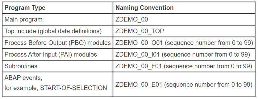 Include programs make the structure of a program easier to understand. The following table displays the naming conventions that are typically used for Includes.