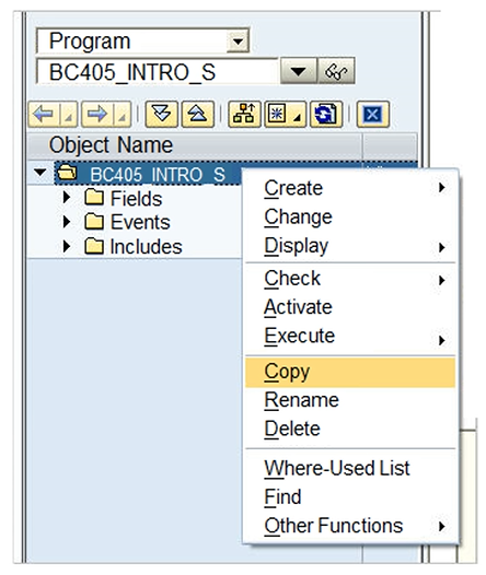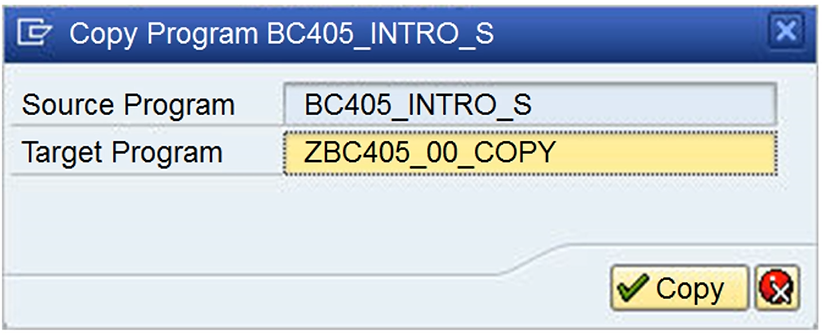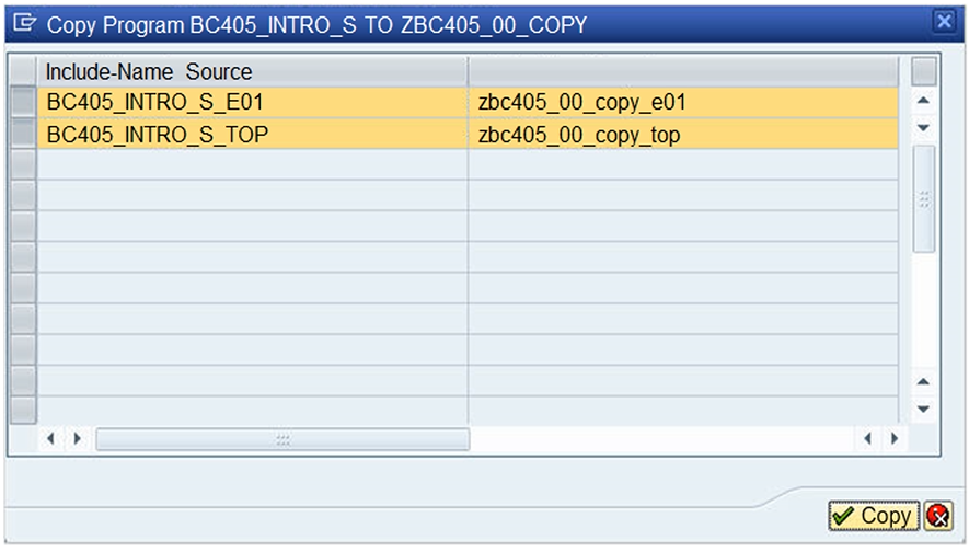In the dialog box that appears, select the rows for those Include programs which you wish to copy. Specify the name of each new Include program along with its correct addition, such as TOP (top Include), E01 (event Include), and F01 (subroutine Include).