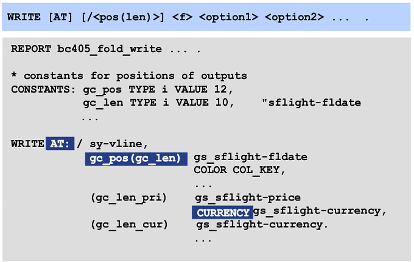 There are additions to the WRITE statement used for formatting and positioning the output in a classic list. An effect of this is that the output (formed of one line) is displayed in the next line. The value of the variable gs_sflight-fldate will be positioned on column 12, as indicated by the constant gc_pos. The variable is a date and it will be shown in the list in external format, specified by the formatting setting of the language environment.
